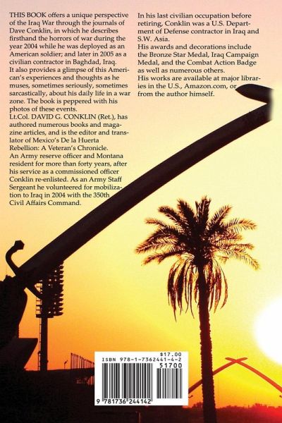 Released during the 20th anniversary of the beginning of the Iraq War, this book offers a unique perspective on the War through the journals of Dave Conklin. He describes firsthand the horrors of war during the year 2004 while he was deployed as an American soldier; and again in 2005 as a civilian contractor in Baghdad, Iraq. It also provides a glimpse of this American's experiences and thoughts as he muses, sometimes seriously, sometimes sarcastically, about his daily life in a war zone. The book is peppered with his photos of these events.