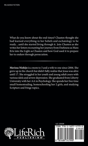 What do you really know about the last days? Chasten thought she knew it all...until she started living through it. Join Chasten from her journey through Darkness into Light and how she looks back to discover-every part of her journey prepared her to stand firm and rest in the God who called her out of Darkness-not her knowledge.