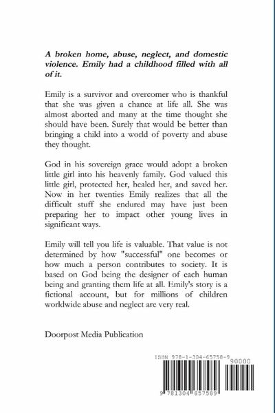 A broken home, abuse, neglect, and domestic violence. Emily had a childhood filled with it. God in His sovereign grace would adopt a broken little girl into His family and bring peace and healing to Emily's life. Now in her twenties Emily realizes that the many difficult trials she endured could equip her to impact other young hurting souls in ways she never imagined. Life is valuable. That value is not determined by how successful one becomes or how much a person contributes to society. It is based on God being the designer of each human being and granting them life at all. Emily's story is a fictional account, but for millions of children worldwide abuse and neglect are very real.