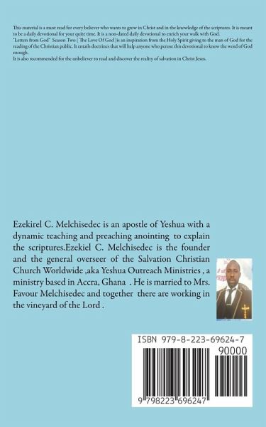 This material is a must read for every believer who wants to grow in Christ and in the knowledge of the scriptures. It is meant to be a daily devotional for your quite time. It is a non-dated daily devotional to enrich your walk with God. "Letters from God" Season Two ( The Love Of God )is an inspiration from the Holy Spirit giving to the man of God for the reading of the Christian public. It entails doctrines that will help anyone who peruse this devotional to know the word of God enough. It is also recommended for the unbeliever to read and discover the reality of salvation in Christ Jesus. It is a thirty-one Days reading plan for your daily devotion. You need to take your time as you read this material and meditate on it for yourself each day. There is a confessional pray "letter from God " make sure you confess and pray along at the end of each letter reading. God bless you as you read on.
