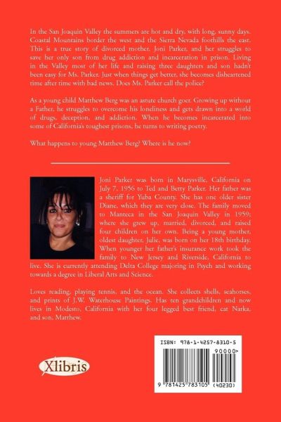 In the San Joaquin Valley the summers are hot and dry, with long, sunny days. Coastal Mountains border the west and the Sierra Nevada foothills the east. This is a true story of divorced mother, Joni Parker, and her struggles to save her only son from drug addiction and incarceration in prison. Living in the Valley most of her life and raising three daughters and son hadn't been easy for Ms. Parker. Just when things get better, she becomes disheartened time after time with bad news. Does Ms. Parker call the police? As a young child Matthew Berg was an astute church goer. Growing up without a Father, he struggles to overcome his loneliness and gets drawn into a world of drugs, deception, and addiction. When he becomes incarcerated into some of California's toughest prisons, he turns to writing poetry. What happens to young Matthew Berg? Where is he now?