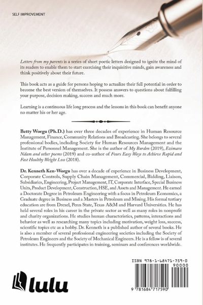 Letters from my parents is a series of short poetic letters designed to ignite the mind of its readers to enable them to start exercising their inquisitive minds, gain awareness and think positively about their future. This book acts as a guide for persons hoping to actualize their full potential in order to become the best version of themselves. It possess answers to questions about fulfilling your purpose, decision making, success and much more. Learning is a continuous life long process and the lessons in this book can benefit anyone no matter his or her age.
