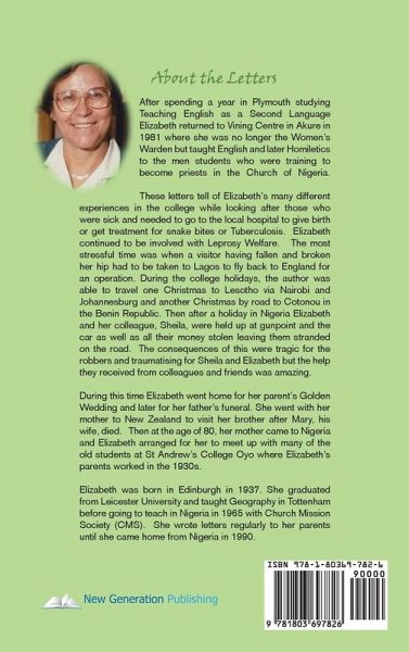 After spending a year in Plymouth studying Teaching English as a Second Language Elizabeth returned to Vining Centre in Akure in 1981 where she was no longer the Women's Warden but taught English and later Homiletics to the men students who were training to become priests in the Church of Nigeria. These letters tell of Elizabeth's many different experiences in the college while looking after those who were sick and needed to go to the local hospital to give birth or get treatment for snake bites or Tuberculosis. Elizabeth continued to be involved with Leprosy Welfare. The most stressful time was when a visitor having fallen and broken her hip had to be taken to Lagos to fly back to England for an operation. During the college holidays, the author was able to travel one Christmas to Lesotho via Nairobi and Johannesburg and another Christmas by road to Cotonou in the Benin Republic. Then after a holiday in Nigeria Elizabeth and her colleague, Sheila, were held up at gunpoint and the car as well as all their money stolen leaving them stranded on the road. The consequences of this were tragic for the robbers and traumatising for Sheila and Elizabeth but the help they received from colleagues and friends was amazing. During this time Elizabeth went home for her parent's Golden Wedding and later for her father's funeral. She went with her mother to New Zealand to visit her brother after Mary, his wife, died. Then at the age of 80, her mother came to Nigeria and Elizabeth arranged for her to meet up with many of the old students at St Andrew's College Oyo where Elizabeth's parents worked in the 1930s. Elizabeth was born in Edinburgh in 1937. She graduated from Leicester University and taught Geography in Tottenham before going to teach in Nigeria in 1965 with Church Mission Society (CMS). She wrote letters regularly to her parents until she came home from Nigeria in 1990.