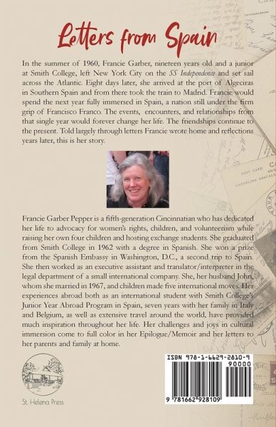 Francie Garber Pepper is a fifth-generation Cincinnatian who has dedicated her life to advocacy for women's rights, children, and volunteerism while raising her own four children and hosting exchange students. She graduated from Smith College in 1962 with a degree in Spanish. She won a prize from the Spanish Embassy in Washington, D.C., a second trip to Spain. She then worked as an executive assistant and translator/interpreter in the legal department of a small international company. She, her husband John, whom she married in 1967, and children made five international moves. Her experiences abroad both as an international student with Smith College's Junior Year Abroad Program in Spain, seven years with her family in Italy and Belgium, as well as extensive travel around the world, have provided much inspiration throughout her life. Her challenges and joys in cultural immersion come to full color in her Epilogue/Memoir and her letters to her parents and family at home.