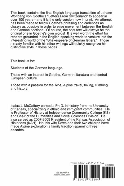 This duel-language book contains the first English-language translation of Johann Wolfgang von Goethe's "Letters From Switzerland" to appear in over 100 years-- and it is the only version now in print. Also included is an introduction, the German-language text, a glossary, interpretive essay, selected bibliography, plus assorted photos and maps [180 pages]. Goethe's expedition through Switzerland and the Savoy during the autumn 1779 traversed a wild Alpine landscape decades before it became the popular "playground of Europe" for thrill-seeking Victorian travelers. For Germany's greatest literary figure, the rugged Alpine landscape was both a place of spiritual and scientific wonder, and an environment that would provide inspiration for many of Goethe's best loved writings.