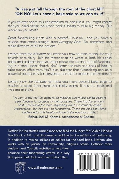 "A tree just fell through the roof of the church!!!" "OH NO! Let's have a bake sale so we can fix it!" If you've ever heard this conversation or one like it, you might realize that you need better tools than cookie sheets to raise big money. But where do you start? Great fundraising starts with a powerful mission… and you have a mission that comes straight from Almighty God: "Go, therefore, and make disciples of all the nations…" "Letters from the Almoner" will teach you how to raise money for your church or ministry. Join the Almoner as he writes to both his parish priest and a determined volunteer about the ins and outs of fundraising in a small, poor church. You'll learn the nuts and bolts of how to raise money effectively. You'll also discover that fundraising can be a powerful opportunity for conversion for the fundraiser and the donor. "Letters from the Almoner" will help you move beyond bake sales to mission-focused fundraising that really works. It has to… souls and lives are at stake.