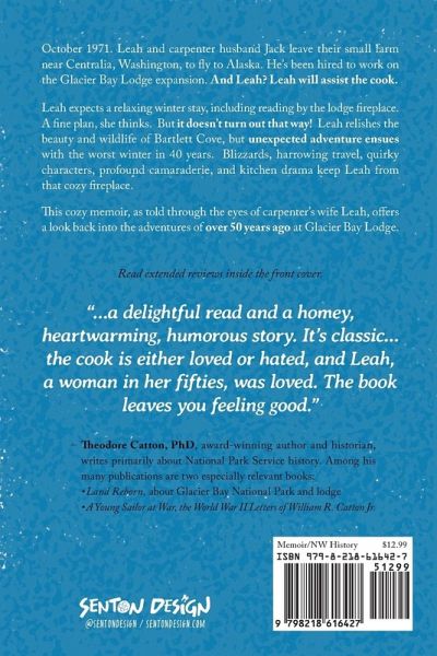 A cozy memoir of Alaskan history, heartwarming and humorous. The book is a compelling tale of blizzards, harrowing travel, quirky characters, fellowship, and kitchen drama. Charming illustrations enhance the engaging storyline written over 50 years ago. Leah Allender's memoir chronicles her winter 1971-72 adventure at Glacier Bay Lodge. Husband Jack had been hired as carpenter foreman for the NPS lodge expansion. Gracious in her daily life, candid in letters to family, Leah loved her time in Alaska during the worst winter in 40 years.