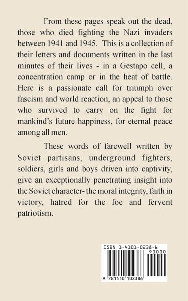 From these pages speak out the dead, those who died fighting the Nazi invaders between 1941 and 1945. This is a collection of their letters and documents written in the last minutes of their lives - in a Gestapo cell, a concentration camp or in the heat of battle. Here is a passionate call for triumph over fascism and world reaction, an appeal to those who survived to carry on the fight for mankind's future happiness, for eternal peace among all men.These words of farewell written by Soviet partisans, underground fighters, soldiers, girls and boys driven into captivity, give an exceptionally penetrating insight into the Soviet character- the moral integrity, faith in victory, hatred for the foe and fervent patriotism.