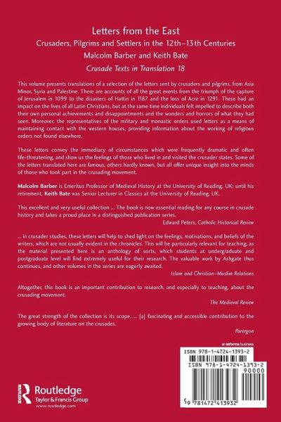 No written source is entirely without literary artifice, but the letters sent from Asia Minor, Syria and Palestine in the high middle ages come closest to recording the real feelings of those who lived in and visited the crusader states. They are not, of course, reflective pieces, but they do convey the immediacy of circumstances which were frequently dramatic and often life-threatening. Those settled in the East faced crises all the time, while crusaders and pilgrims knew they were experiencing defining moments in their lives. There are accounts of all the great events from the triumph of the capture of Jerusalem in 1099 to the disasters of Hattin in 1187 and the loss of Acre in 1291. These had an impact on the lives of all Latin Christians, but at the same time individuals felt impelled to describe both their own personal achievements and disappointments and the wonders and horrors of what they had seen. Moreover, the representatives of the military and monastic orders used letters as a means of maintaining contact with the western houses, providing information about the working of religious orders not found elsewhere. Some of the letters translated here are famous, others hardly known, but all offer unique insight into the minds of those who took part in the crusading movement.