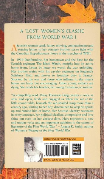 "A new and unique voice and an important addition to the canon of literature of the First World War." - Prof. Angela K. Smith, author of Women's Writing of the First World War A 'lost' women's classic from World War I - discovered in the rare books room of the British Library, last seen in 1917! A Scottish woman sends funny, moving, compassionate and rousing letters to her younger brother, set to fight with the Canadian Expeditionary Force in the trenches of WWI. Dunfermline, her hometown and the base for the Scottish regiment The Black Watch, morphs into an active home front. Letter by letter we watch the war unfolding. Her brother trains with his cavalry regiment on England's Salisbury Plain and moves to frontline duty in France. Shocked by the war and those who inflame it, the sister’s letters are frank and also encouraging. Others are vanishing. She needs her brother, her young Canadian, to survive. Complete with an introduction, a closing biography, and original photographs of the author and the period.