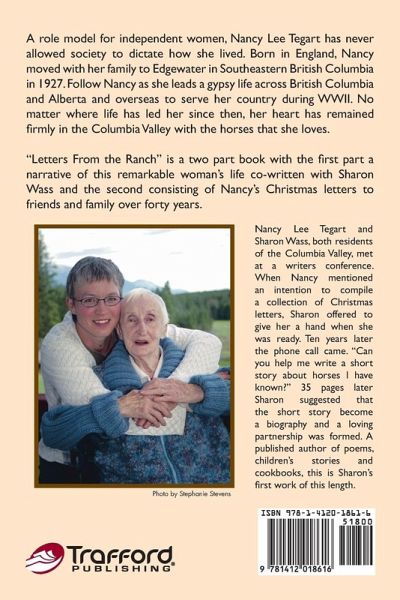 Nancy Lee Tegart is an independent woman who has never in her 90+ years allowed society to dictate how she should live. Born in England, Nancy moved to Edgewater in Southwestern British Columbia in 1927. She was allowed to leave school in the Depression years to help on her uncle's ranch. No matter where life has led her since then, her heart has remained firmly in the Columbia Valley with the horses that she loves. Follow Nancy as she leads a gypsy life across British Columbia and Alberta and overseas to serve her country in WWII. Her faith in God and love of animals has sustained Nancy through good times and bad. Letters from the Ranch is a two-part book; the first part is a narrative of this remarkable woman's life co-written by Sharon Wass, the second half consists of Nancy's annual Christmas letters that she sent to friends and family over forty years.