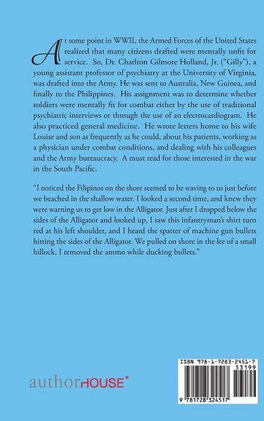 At some point in WWII, the Armed Forces of the United States realized that many citizens drafted were mentally unfit for service. So, Dr. Charlton Gilmore Holland, Jr. ("Gilly"), a young assistant professor of psychiatry at the University of Virginia, was drafted into the Army. He was sent to Australia, New Guinea, and finally to the Philippines. His assignment was to determine whether soldiers were mentally fit for combat either by the use of traditional psychiatric interviews or through the use of an electrocardiogram. He also practiced general medicine. He wrote letters home to his wife…mehr