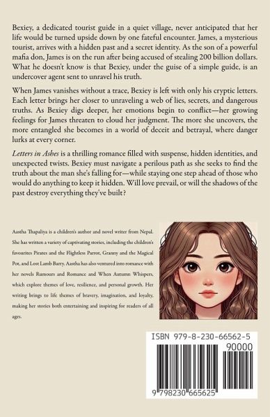 Bexiey, a dedicated tourist guide in a quiet village, never anticipated that her life would be turned upside down by one fateful encounter. James, a mysterious tourist, arrives with a hidden past and a secret identity. As the son of a powerful mafia don, James is on the run after being accused of stealing 200 billion dollars. What he doesn't know is that Bexiey, under the guise of a simple guide, is an undercover agent sent to unravel his truth. When James vanishes without a trace, Bexiey is left with only his cryptic letters. Each letter brings her closer to unraveling a web of lies, secrets, and dangerous truths. As Bexiey digs deeper, her emotions begin to conflict-her growing feelings for James threaten to cloud her judgment. The more she uncovers, the more entangled she becomes in a world of deceit and betrayal, where danger lurks at every corner. Letters in Ashes is a thrilling romance filled with suspense, hidden identities, and unexpected twists. Bexiey must navigate a perilous path as she seeks to find the truth about the man she's falling for-while staying one step ahead of those who would do anything to keep it hidden. Will love prevail, or will the shadows of the past destroy everything they've built?
