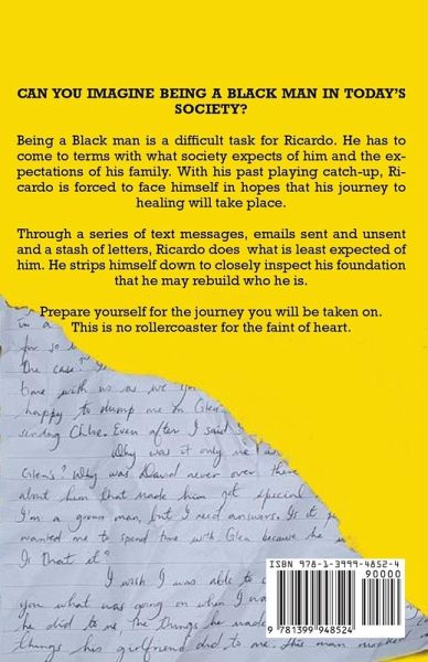 To be a Black man in today's world is nothing near easy. Society has taught them to be hardened individuals, making it difficult to open up and ask for support when needed. Ricardo Bennett finds himself battling with the demons of his past as he navigates through life in hopes of healing himself. Ricardo attributes some of his behaviours towards women to being connected to what he was subjected to seeing within his home as well as lessons received from his uncle Glen. Reflecting on his past, Ricardo writes letters to family members - his parents, his niece Avery, his cousin Niyah, his ex, and himself as a form of therapy. He aims to make amends for his behaviour by reaching out to Niyah, yet fails to open up to another of his cousins, Chloe. Ricardo's introspection can be viewed as being influenced by text messages from Shayla, a stranger who became one of his closest friends. Some Black men wear masks created at a very young age. What role did you play in who they are today?