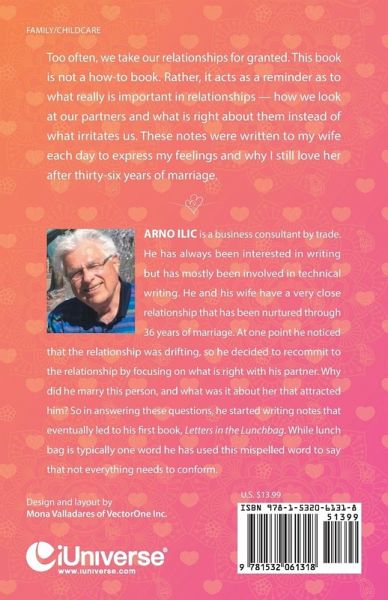 Too often, we take our relationships for granted. This book is not a how-to book. Rather, it acts as a reminder as to what really is important in relationships - how we look at our partners and what is right about them instead of what irritates us. These notes were written to my wife each day to express my feelings and why I still love her after thirty-six years of marriage.