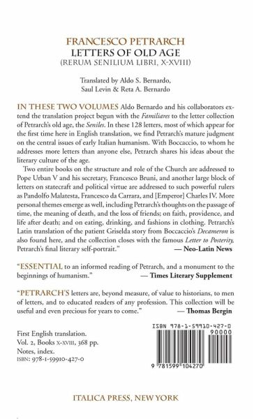 Aldo Bernardo and his collaborators extend the translation project begun with the Familiares to the letter collection of Petrarch's old age, the Seniles. In these 128 letters, most of which appear for the first time here in English translation, we find Petrarch's mature judgment on the central issues of early Italian humanism. With Boccaccio, to whom he addresses more letters than anyone else, Petrarch shares his ideas about the literary culture of the age. Two entire books on the structure and role of the Church are addressed to Pope Urban V and his secretary, Francesco Bruni, and another large block of letters on statecraft and political virtue are addressed to such powerful rulers as Pandolfo Malatesta, Francesco da Carrara, and [Emperor] Charles IV. More personal themes emerge as well, including Petrarch's thoughts on the passage of time, the meaning of death, and the loss of friends; on faith, providence, and life after death; and on eating, drinking, and fashions in clothing. Petrarch's Latin translation of the patient Griselda story from Boccaccio's "Decameron" is also found here, and the collection closes with the famous Letter to Posterity, Petrarch's final literary self-portrait." - Neo-Latin News THIS COMPLETE TRANSLATION has long been out of print and is reproduced here in its entirety in two volumes. Vol. 2, Books X-XVIII, 368 pp. Introduction, notes, bibliography.