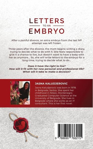 A true story. A broken marriage. A frozen embryo. And one impossible decision: SHOULD IT not LIVE? __________________________________ Letters to an Embryo is an autobiographical novel that explores the deeply personal journey of Jasna Kaludjerovic as she grapples with the aftermath of a painful divorce. Left with a frozen embryo from the final IVF attempt, she feels torn between the responsibility of giving it a chance to live and the emotional weight of her past. Over the course of many letters, Jasna writes to the embryo, reflecting on motherhood, identity, and the complexities of letting go. The novel touches on themes of loss, hope, and the quiet resilience of the human spirit, offering readers an intimate exploration of one woman's emotional and psychological struggle. With honesty and vulnerability, Kaludjerovic invites readers to walk with her through a personal crisis that many can relate to, yet few are willing to speak about. Does it have the right to life? How will it fit with her new role now? What does it take to make a decision? __________________ ¿¿ Content Warning: This memoir includes themes of infertility, IVF, divorce, emotional distress, and ethical dilemmas surrounding reproductive choices. __________________ Editorial Reviews "Raises intriguing, morally complex, and timely issues." - Kirkus Reviews "About divorce, loneliness, and healing after betrayal, Letters to an Embryo is an intimate memoir. " - Foreword Clarion Reviews "Jasna Kaludjerovic's vulnerable memoir is about processing the dissolution of her marriage through letters to their last frozen embryo." - Foreword Clarion Reviews "The letters spend significant time on the role of women in society and how she now sees her own place in the world. She had always wanted to be a mother, but now she is wrestling with who she is." -BlueInk Review "In this sweet, poignant memoir, Jasna Kaludjerovic writes to her last viable frozen embryo, deciding whether to go ahead with a pregnancy when she and her husband-the embryo's 'papa' - are divorcing. She mourns the demise of her marriage but seizes on her newfound freedom to find a new man and craft a new career." - BlueInk Review