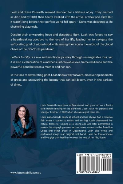 Leah and Steve Polwarth seemed destined for a lifetime of joy. They married in 2017, and by 2019, their hearts swelled with the arrival of their son, Billy. But it wasn't long before their perfect world fell apart - Steve was delivered a life shattering diagnosis. Despite their unwavering hope and desperate fight, Leah was forced to say a heartbreaking goodbye to the love of her life, leaving her to navigate the suffocating grief of widowhood while raising their son in the midst of the global chaos of the COVID-19 pandemic. Letters to Billy is a raw and emotional journey through unimaginable loss, yet it is also a celebration of a mother's unbreakable love, fierce resilience and the powerful bond between a mother and her son. In the face of devastating grief, Leah finds a way forward, discovering moments of grace and uncovering the beauty that can still bloom, even in the darkest of times.