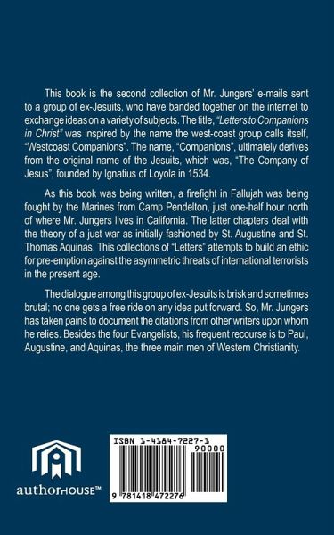 This book is the second collection of Mr. Jungers' e-mails sent to a group of ex-Jesuits, who have banded together on the internet to exchange ideas on a variety of subjects. The title, "Letters to Companions in Christ" was inspired by the name the west-coast group calls itself, "Westcoast Companions". The name, "Companions", ultimately derives from the original name of the Jesuits, which was, "The Company of Jesus", founded by Ignatius of Loyola in 1534. As this book was being written, a firefight in Fallujah was being fought by the Marines from Camp Pendelton, just one-half hour north of where Mr. Jungers lives in California. The latter chapters deal with the theory of a just war as initially fashioned by St. Augustine and St. Thomas Aquinas. This collections of "Letters" attempts to build an ethic for pre-emption against the asymmetric threats of international terrorists in the present age. The dialogue among this group of ex-Jesuits is brisk and sometimes brutal; no one gets a free ride on any idea put forward. So, Mr. Jungers has taken pains to document the citations from other writers upon whom he relies. Besides the four Evangelists, his frequent recourse is to Paul, Augustine, and Aquinas, the three main men of Western Christianity.