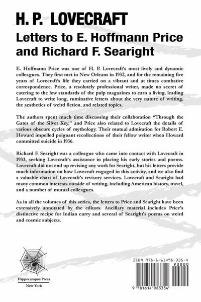 E. Hoffmann Price was one of H. P. Lovecraft's most lively and dynamic colleagues. They first met in New Orleans in 1932, and for the remaining five years of Lovecraft's life they carried on a vibrant and at times combative correspondence. Price, a resolutely professional writer, made no secret of catering to the low standards of the pulp magazines to earn a living, leading Lovecraft to write long, ruminative letters about the very nature of writing, the aesthetics of weird fiction, and related topics. The authors spent much time discussing their collaboration "Through the Gates of the Silver Key," and Price also related to Lovecraft the details of various obscure cycles of mythology. Their mutual admiration for Robert E. Howard impelled poignant recollections of their fellow writer when Howard committed suicide in 1936. Richard F. Searight was a colleague who came into contact with Lovecraft in 1933, seeking Lovecraft's assistance in placing his early stories and poems. Lovecraft did not end up revising any work for Searight, but his letters provide much information on how Lovecraft engaged in this activity, and we also find a valuable chart of Lovecraft's revisory services. Lovecraft and Searight had many common interests outside of writing, including American history, travel, and a number of mutual colleagues. As in all the volumes of this series, the letters to Price and Searight have been extensively annotated by the editors. Ancillary material includes Price's distinctive recipe for Indian curry and several of Searight's poems on weird and cosmic subjects.