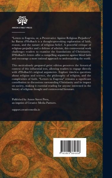 "Letters to Eugenia, or, a Preservative Against Religious Prejudices" by Baron d'Holbach is a thought-provoking exploration of faith, reason, and the nature of religious belief. A powerful critique of religious prejudice and a defense of atheism, this controversial work challenges readers to examine the foundations of Christianity. D'Holbach's letters offer a compelling argument against blind faith and encourage a more rational approach to understanding the world. This meticulously prepared print edition preserves the historical context of this influential text, allowing readers to engage directly with d'Holbach's original arguments. Explore timeless questions about religion and science, the philosophy of religion, and the complexities of faith. "Letters to Eugenia" remains a significant contribution to discussions surrounding Christianity and its impact on society, making it essential reading for anyone interested in the history of religious thought and controversial literature. This work has been selected by scholars as being culturally important, and is part of the knowledge base of civilization as we know it. This work is in the public domain in the United States of America, and possibly other nations. Within the United States, you may freely copy and distribute this work, as no entity (individual or corporate) has a copyright on the body of the work. Scholars believe, and we concur, that this work is important enough to be preserved, reproduced, and made generally available to the public. We appreciate your support of the preservation process, and thank you for being an important part of keeping this knowledge alive and relevant.