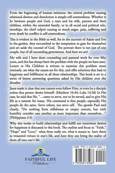 From the beginning of human existence, self-centeredness has been the central problem causing relational distress and dissolution. Whether it be between people and God, a man and his wife, parents and their children, within the extended family, or in all social and political relationships, self-centeredness is the chief culprit causing so much anger, pain, suffering, and even death by conflict. This is also evident in the Bible, for in the account of Adam and Eve in the garden, they succumbed to the temptation to gain for themselves and set aside God's counsel. The portrait is not just of one couple but of all succeeding generations. And here we are! My wife and I have done counseling and pastoral work for over fifty years, and this has always been the problem with the people we have seen. Letters to His Children is written to examine this problem more intensely, see what the causes are for this, and offer solutions that lead to happiness and fulfillment in all these relationships. This book is set in a series of letters answering questions asked by His children over the decades. Jesus made it clear that one cannot even follow Him, or even be a disciple unless that person denies himself. (Matthew 16:44; Luke 14:26) In His case, he said that He, "...came to serve, not to be served, and to give His life as a ransom for many. He commands that people, especially His people do the same. Serve others, not serve self. The apostle Paul said clearly, "Do nothing from selfishness or empty conceit, but with humility consider one another as more important than yourselves..." (Philippians 2:3) Why this works to build relationships and fulfill our innermost desires for happiness is discussed in this book. The outline and focus are: "Faith," "Hope" and "Love;" what these are, what it means to have them as treasured virtues in one's life, and how they can bring the reality of them all into one's life.
