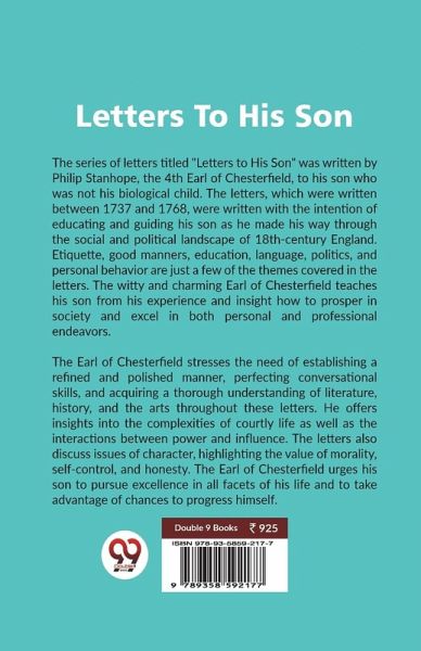 The series of letters titled "Letters to His Son" was written by Philip Stanhope, the 4th Earl of Chesterfield, to his son who was not his biological child. The letters, which were written between 1737 and 1768, were written with the intention of educating and guiding his son as he made his way through the social and political landscape of 18th-century England. Etiquette, good manners, education, language, politics, and personal behavior are just a few of the themes covered in the letters. The witty and charming Earl of Chesterfield teaches his son from his experience and insight how to prosper in society and excel in both personal and professional endeavors. The Earl of Chesterfield stresses the need of establishing a refined and polished manner, perfecting conversational skills, and acquiring a thorough understanding of literature, history, and the arts throughout these letters. He offers insights into the complexities of courtly life as well as the interactions between power and influence. The letters also discuss issues of character, highlighting the value of morality, self-control, and honesty. The Earl of Chesterfield urges his son to pursue excellence in all facets of his life and to take advantage of chances to progress himself.
