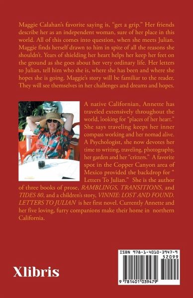 Maggie Calahan's favorite saying is, "get a grip." Her friends describe her as an independent woman, sure of her place in this world. All of this comes into question, when she meets Julian. Maggie finds herself drawn to him in spite of all the reasons she shouldn't. Years of shielding her heart helps her keep her feet on the ground as she goes about her very ordinary life. Her letters to Julian, tell him who she is, where she has been and where she hopes she is going. Maggie's story will be familiar to the reader. They will see themselves in her challenges and dreams and hopes.