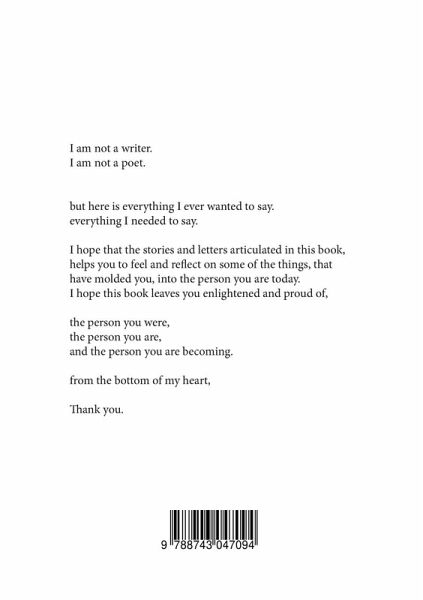 I am not a writer.I am not a poet.but here is everything I ever wanted to say. everything I needed to say. I hope that the stories and letters articulated in this book,helps you to feel and reflect on some of the things, that have molded you, into the person you are today.I hope this book leaves you enlightened and proud of, the person you were, the person you are, and the person you are becoming. from the bottom of my heart,Thank you.