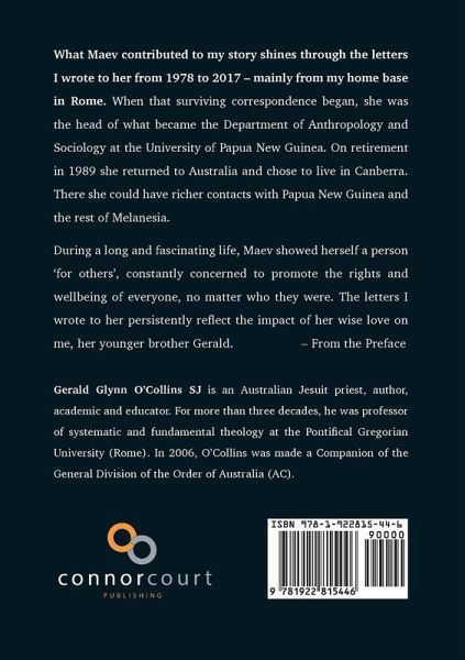 What Maev contributed to my story shines through the letters I wrote to her from 1978 to 2017 - mainly from my home base in Rome. When that surviving correspondence began, she was the head of what became the Department of Anthropology and Sociology at the University of Papua New Guinea. On retirement in 1989 she returned to Australia and chose to live in Canberra. There she could have richer contacts with Papua New Guinea and the rest of Melanesia. During a long and fascinating life, Maev showed herself a person 'for others', constantly concerned to promote the rights and wellbeing of everyone, no matter who they were. The letters I wrote to her persistently reflect the impact of her wise love on me, her younger brother Gerald. - From the Preface Gerald Glynn O'Collins SJ is an Australian Jesuit priest, author, academic and educator. For more than three decades, he was professor of systematic and fundamental theology at the Pontifical Gregorian University (Rome). In 2006, O'Collins was made a Companion of the General Division of the Order of Australia (AC).
