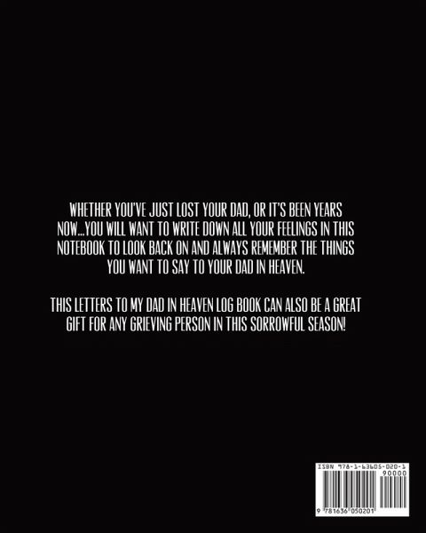 How to Use this Letters To My Dad In Heaven Diary: 8 X 10 Inches 120 Pages The purpose of this Letters to My Dad In Heaven is to keep all your various heart feels and thoughts organized in one easy to find spot. Here are some simple guidelines to follow so you can make the most of using this book: The first "Dear Dad, I Wanted To Call You Today And Tell You" section is for you to write out what you want to say to your dad, how you felt..so you can go back there to be reminded of your journey... Most ideas are inspired by something we have seen. Use the "This Is What Heaven Will Be Like When We Are Together" section to write down all the things you wish about that day will be like... The "This Is What I Imagine You Doing Up In Heaven Right Now" section is for you to write out all the things you imagine dad doing and recording your journey of loss... And even more pages with the "When We Meet Up in Heaven Again, The First Thing We Will Do Is" section is great for writing out the plans you wish and dream to be doing with dad.... The "Today I Am Really Missing" section is for you to keep a visual reminder of each dream you have for things and plans you have when you are reunited in heaven... The "I Am Having A Hard Time With" section is for you to describe your struggles and heart hurts with loss of dad..... The "The Hardest Time of Day Is" section is for you to write out the time of day you feel down or depressed about missing dad and, any heart feels especially helpful for remembering later on... The "I Have Been Feeling A Lot Of" section is for you to write out keepsake memories of how you're feeling about missing your dad, your story, your journey so your heart feels listened to.... Use this "I Could Use Some More" section as the place to lay out your plan of what you could use more of at this sorrowful time of loss and so your heart will feel understood...and much more! Whether you've just lost your dad, or it's been years now...you will want to write down all your heart feels in this notebook to look back on and always remember the things you want to say to your dad in heaven. This Letters To My Dad In Heaven Log Book can also be a great gift for any grieving person in this sorrowful season! Size is 8 X 10 inches, 120 pages, soft matte finish cover. Bless!