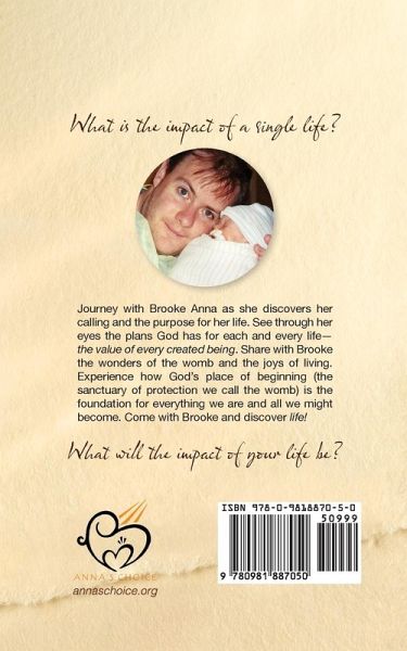 What is the impact of a single life? Journey with Brooke Anna as she discovers her calling and the purpose for her life. Discover with Brooke the plans God has for each and every life-the value of every created being. Share with her the wonders of the womb and the joys of living. Experience how God's place of beginning (the sanctuary of protection we call the womb) is the foundation for everything we are and all we might become. Come with Brooke and discover life!