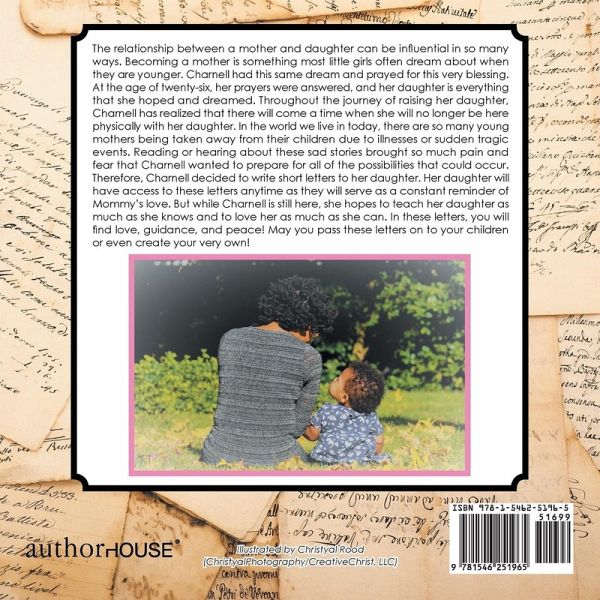 The relationship between a mother and daughter can be influential in so many ways. Becoming a mother is something most little girls often dream about when they are younger. Charnell had this same dream and prayed for this very blessing. At the age of twenty-six, her prayers were answered, and her daughter is everything that she hoped and dreamed. Throughout the journey of raising her daughter, Charnell has realized that there will come a time when she will no longer be here physically with her daughter. In the world we live in today, there are so many young mothers being taken away from their children due to illnesses or sudden tragic events. Reading or hearing about these sad stories brought so much pain and fear that Charnell wanted to prepare for all of the possibilities that could occur. Therefore, Charnell decided to write short letters to her daughter. Her daughter will have access to these letters anytime as they will serve as a constant reminder of Mommys love. But while Charnell is still here, she hopes to teach her daughter as much as she knows and to love her as much as she can. In these letters, you will find love, guidance, and peace! May you pass these letters on to your children or even create your very own!