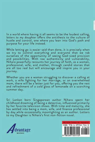 In a world where having it all seems to be the loudest calling, letters to my daughter offers the antithesis to the culture of hustle and control, one where you lean into God's path and purpose for your life instead. While letting go is easier said than done, it is precisely when we try to control everything and everyone that we rob ourselves of the opportunity of seeing God-sized provision and possibilities. With raw authenticity and vulnerability, Nihara powerfully recounts her journey of faith, as a woman, professional, wife, and mother, through candid stories that are all too real but will encourage and inspire you in your journey. Whether you are a woman struggling to discover a calling at work, a wife fighting for her marriage, or an overwhelmed mom, there will be a letter just for you, offering you the rest and refreshment of a cold glass of lemonade on a scorching summer day.