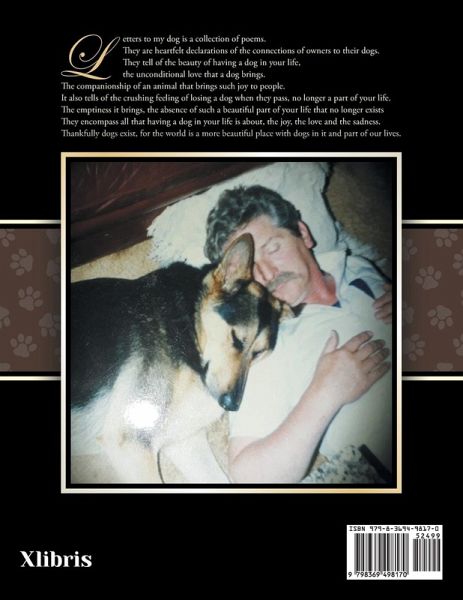Letters to my dog is a collection of poems. They are heartfelt declarations of the connections of owners to their dogs. They tell of the beauty of having a dog in your life, the unconditional love that a dog brings. The companionship of an animal that brings such joy to people. It also tells of the crushing feeling of losing a dog when they pass, no longer a part of your life. The emptiness it brings, the absence of such a beautiful part of your life that no longer exists They encompass all that having a dog in your life is about, the joy, the love and the sadness. Thankfully dogs exist, for the world is a more beautiful place with dogs in it and part of our lives.