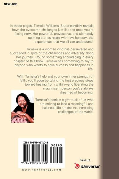 In these pages, Tameka Williams-Bruce candidly reveals how she overcame challenges just like the ones you're facing now. Her powerful, provocative, and ultimately uplifting stories relate with raw honesty, the experiences that we all can understand. Tameka is a woman who has persevered and succeeded in spite of the challenges and adversity along her journey. I found something encouraging in every chapter of this book. Tameka has something to say to anyone who wants to have success and happiness in life. With Tameka's help and your own inner strength of faith, you'll soon be taking the first precious steps toward healing from within-and liberating the magnificent person you've always dreamed of becoming.