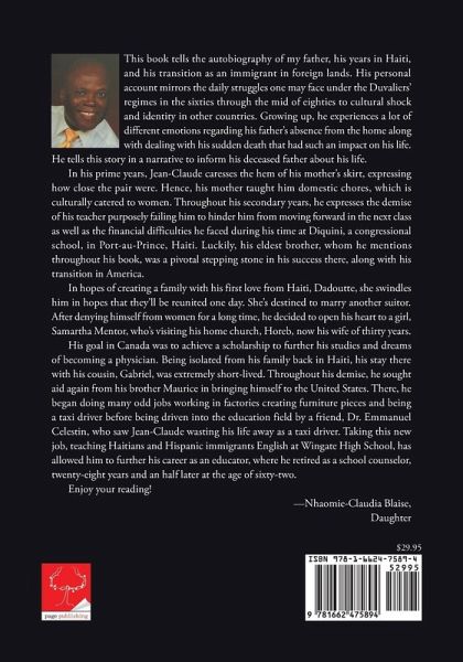 This book tells the autobiography of my father, his years in Haiti, and his transition as an immigrant in foreign lands. His personal account mirrors the daily struggles one may face under the Duvaliers' regimes in the sixties through the mid of eighties to cultural shock and identity in other countries. Growing up, he experiences a lot of different emotions regarding his father's absence from the home along with dealing with his sudden death that had such an impact on his life. He tells this story in a narrative to inform his deceased father about his life. In his prime years, his dad caresses the hem of his mother's skirt, expressing how close the pair were. Hence, his mother taught him domestic chores, which is culturally catered to women. Throughout his secondary years, he expresses the demise of his teacher purposely failing him to hinder him from moving forward in the next class as well as the financial difficulties he faced during his time at Diquini, a congressional school, in Port-au-Prince, Haiti. Luckily, his eldest brother, whom he mentions throughout his book, was a pivotal stepping stone in his success there, along with his transition in America. In hopes of creating a family with his first love from Haiti, Dadoutte, she swindles him in hopes that they'll be reunited one day. She's destined to marry another suitor. After denying himself from women for a long time, he decided to open his heart to a girl, Samartha Mentor, who's visiting his home church, Horeb, now his wife of thirty years. His goal in Canada was to achieve a scholarship to further his studies and dreams of becoming a physician. Being isolated from his family back in Haiti, his stay there with his cousin, Gabriel, was extremely short-lived. Throughout his demise, he sought aid again from his brother Maurice in bringing himself to the United States. There, he began doing many odd jobs working in factories creating furniture pieces and being a taxi driver before being driven into the education field by a friend, Dr. Emmanuel Celestin, who saw Jean-Claude wasting his life away as a taxi driver. Taking this new job, teaching Haitians and Hispanic immigrants English at Wingate High School, has allowed him to further his career as an educator, where he retired as a school counselor, twenty-eight years and an half later at the age of sixty-two. Enjoy your reading! Nhaomie-Claudia Blaise, Daughter