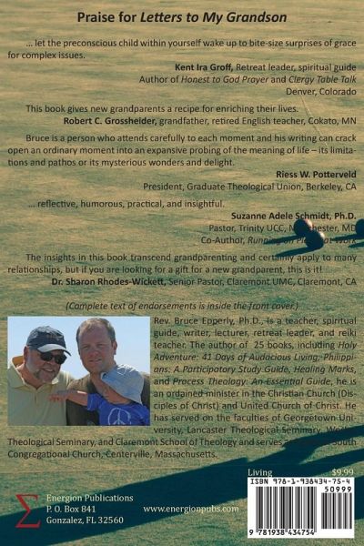 What lasting words might a grandfather say to his grandson that would be lasting? What might develop from such a conversation? Bruce Epperly, author, pastor, and theologian, set out to write regular letters to his grandson during the first year of the child's life. Letters to my Grandson is a love story describing the relationship between a grandfather and his grandson. It celebrates the love of a family, including events of great joy and even grief. The author shares his revelation that the love of a grandson can grow into love for every child of this earth, a lesson taught by a child. This is also a book of many adventures, common to us all but often overlooked in the frenetic pace of our everyday lives. Dr. Epperly, a self-professed "aging baby boomer" is finding renewal on his hands and knees as he crawls alongside his grandson, sings remembered childhood songs and looks at the world through those infant eyes. "Love grows wings and enables our hearts to soar in so many ways every day. Jewish wisdom says that there is an angel whispering 'grow, grow' over every blade of grass. I am sure that an angel is whispering to my grandson Jack, 'grow, grow.' Creative wisdom, moving well beneath his consciousness and mine, lures him forward moment by moment on this amazing adventure of becoming a child of God on this good Earth." - Bruce Epperly You might want to read this to develop your own understanding, or at the appropriate time, share these thoughts with your own child or grandchild.