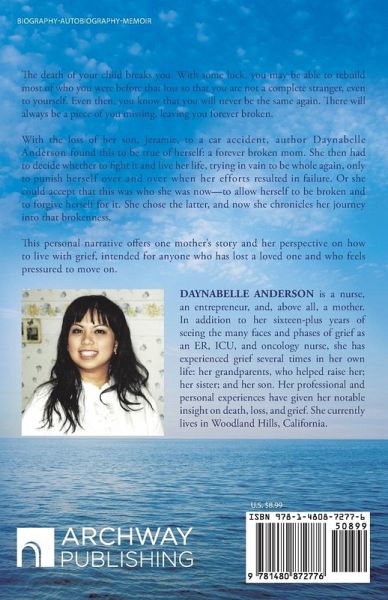 The death of your child breaks you. With some luck, you may be able to rebuild most of who you were before that loss so that you are not a complete stranger, even to yourself. Even then, you know that you will never be the same again. There will always be a piece of you missing, leaving you forever broken. With the loss of her son, Jeramie, to a car accident, author Daynabelle Anderson found this to be true of herself: a forever broken mom. She then had to decide whether to fight it and live her life, trying in vain to be whole again, only to punish herself over and over when her efforts resulted in failure. Or she could accept that this was who she was now--to allow herself to be broken and to forgive herself for it. She chose the latter, and now she chronicles her journey into that brokenness. This personal narrative offers one mother's story and her perspective on how to live with grief, intended for anyone who has lost a loved one and who feels pressured to move on.