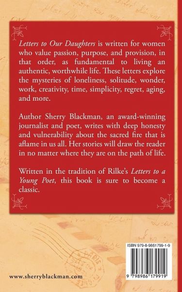 Letters to Our Daughters is written for women who value passion, purpose, and provision, in that order, as fundamental to living an authentic, worthwhile life. These letters explore the mysteries of loneliness, solitude, wonder, work, creativity, time, simplicity, regret, aging, and more. Author Sherry Blackman, an award-winning journalist and poet, writes with deep honesty and vulnerability about the sacred fire that is aflame in us all. Her stories will draw the reader in no matter where they are on the path of life. Written in the tradition of Rilke's Letters to a Young Poet, this book is sure to become a classic.
