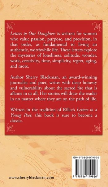 Letters to Our Daughters is written for women who value passion, purpose, and provision, in that order, as fundamental to living an authentic, worthwhile life. These letters explore the mysteries of loneliness, solitude, wonder, work, creativity, time, simplicity, regret, aging, and more. Author Sherry Blackman, an award-winning journalist and poet, writes with deep honesty and vulnerability about the sacred fire that is aflame in us all. Her stories will draw the reader in no matter where they are on the path of life. Written in the tradition of Rilke's Letters to a Young Poet, this book is sure to become a classic.