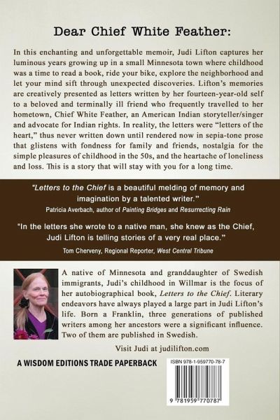 In this enchanting and unforgettable memoir, Judi Lifton captures her luminous years growing up in a small Minnesota town where childhood was a time to read a book, ride your bike, explore the neighborhood and let your mind sift through unexpected discoveries. Lifton's memories are creatively presented as letters written by her fourteen-year-old self to a beloved and terminally ill friend who frequently travelled to her hometown, Chief White Feather, an American Indian storyteller/singer and advocate for Indian rights. In reality, the letters were "letters of the heart," thus never written down until rendered now in sepia-tone prose that glistens with fondness for family and friends, nostalgia for the simple pleasures of childhood in the 50s, and the heartache of loneliness and loss. This is a story that will stay with you for a long time.