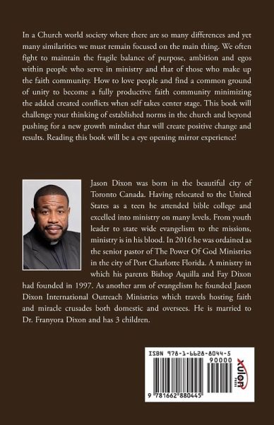 In a Church world society where there are so many differences and yet many similarities we must remain focused on the main thing. We often fight to maintain the fragile balance of purpose, ambition and egos within people who serve in ministry and that of those who make up the faith community. How to love people and find a common ground of unity to become a fully productive faith community minimizing the added created conflicts when self takes center stage. This book will challenge your thinking of established norms in the church and beyond pushing for a new growth mindset that will create positive change and results. Reading this book will be a eye opening mirror experience! Jason Dixon was born in the beautiful city of Toronto Canada. Having relocated to the United States as a teen he attended bible college and excelled into ministry on many levels. From youth leader to state wide evangelism to the missions, ministry is in his blood. In 2016 he was ordained as the senior pastor of The Power Of God Ministries in the city of Port Charlotte Florida. A ministry in which his parents Bishop Aquilla and Fay Dixon had founded in 1997. As another arm of evangelism he founded Jason Dixon International Outreach Ministries which travels hosting faith and miracle crusades both domestic and oversees. He is married to Dr. Franyora Dixon and has 3 children.