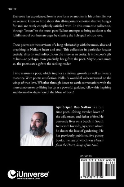 Everyone has experienced love in one form or another in his or her life, yet we seem to know so little about this all-important emotion that we hunger for and are rarely completely satisfied with. In this romantic collection, through "letters" to the muse, poet Nalkur attempts to bring us closer to the fulfillment of our human urges by chasing the holy grail of true love. These poems are the survivors of a long relationship with the muse, alive and breathing in Nalkur’s heart and soul. This collection in particular focuses entirely, directly and indirectly, on the muse as an entity. It is the poet’s gift to her—or perhaps, more precisely, her gift to the poet. Maybe, even more so, the poems are a gift to the seeking reader. Time matures a poet, which implies a spiritual growth as well as literary maturity. With poetic satisfaction, Nalkur’s words lift us heavenward on the wings of true love. Whether through down-to-earth conversations with the muse as nature or by lifting her up as a powerful goddess, follow this inspiring and dream-like depiction of the Muse of Love!