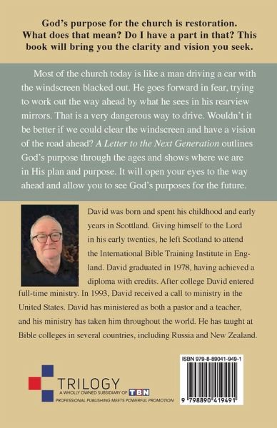 God's purpose for the church is restoration. What does that mean? Do I have a part in that? This book will bring you the clarity and vision you seek. Most of the church today is like a man driving a car with the windscreen blacked out. He goes forward in fear, trying to work out the way ahead by what he sees in his rearview mirrors. That is a very dangerous way to drive. Wouldn't it be better if we could clear the windscreen and have a vision of the road ahead? A Letter to the Next Generation outlines God's purpose through the ages and shows where we are in His plan and purpose. It will open your eyes to the way ahead and allow you to see God's purposes for the future.