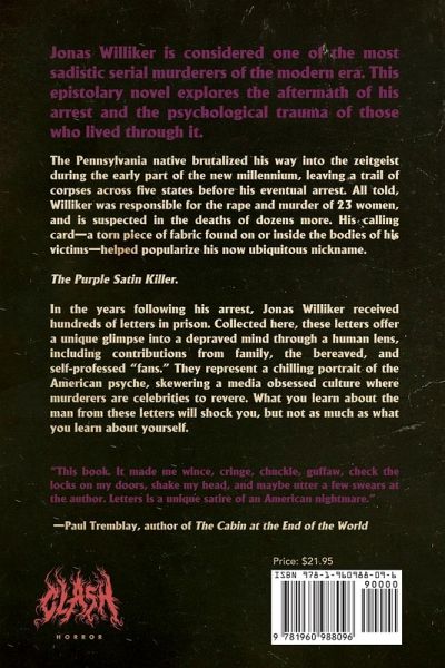 Jonas Williker is considered one of the most sadistic serial murderers of the modern era. This epistolary novel explores the aftermath of his arrest and the psychological trauma of those who lived through it. The Pennsylvania native brutalized his way into the zeitgeist during the early part of the new millennium, leaving a trail of corpses across five states before his eventual arrest. All told, Williker was responsible for the rape and murder of 23 women, and is suspected in the deaths of dozens more. His calling card-a torn piece of fabric found on or inside the bodies of his victims—helped popularize his now ubiquitous nickname. The Purple Satin Killer. In the years following his arrest, Jonas Williker received hundreds of letters in prison. Collected here, these letters offer a unique glimpse into a depraved mind through a human lens, including contributions from family, the bereaved, and self-professed "fans." They represent a chilling portrait of the American psyche, skewering a media obsessed culture where murderers are celebrities to revere. What you learn about the man from these letters will shock you, but not as much as what you learn about yourself.
