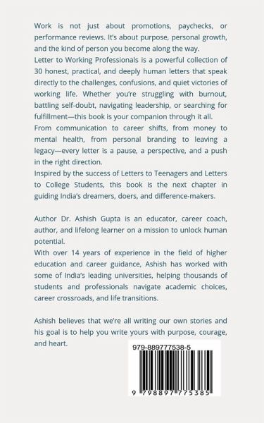 Are you working hard but wondering if you're truly growing? Feeling stuck, stressed, or questioning your path? This book is for you. Work is not just about promotions, paychecks, or performance reviews. It's about purpose, personal growth, and the kind of person you become along the way. Letter to Working Professionals is a powerful collection of 30 honest, practical, and deeply human letters that speak directly to the challenges, confusions, and quiet victories of working life. Whether you're struggling with burnout, battling self-doubt, navigating leadership, or searching for fulfillment-this book is your companion through it all. From communication to career shifts, from money to mental health, from personal branding to leaving a legacy-every letter is a pause, a perspective, and a push in the right direction. Inspired by the success of Letters to Teenagers and Letters to College Students, this book is the next chapter in guiding India's dreamers, doers, and difference-makers.