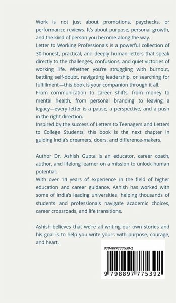 Are you working hard but wondering if you're truly growing? Feeling stuck, stressed, or questioning your path? This book is for you. Work is not just about promotions, paychecks, or performance reviews. It's about purpose, personal growth, and the kind of person you become along the way. Letter to Working Professionals is a powerful collection of 30 honest, practical, and deeply human letters that speak directly to the challenges, confusions, and quiet victories of working life. Whether you're struggling with burnout, battling self-doubt, navigating leadership, or searching for fulfillment-this book is your companion through it all. From communication to career shifts, from money to mental health, from personal branding to leaving a legacy-every letter is a pause, a perspective, and a push in the right direction. Inspired by the success of Letters to Teenagers and Letters to College Students, this book is the next chapter in guiding India's dreamers, doers, and difference-makers.