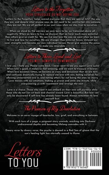 Letters to You: The Complete Collection Letters to the Forgotten Your Struggles Do Not Define You "Letters to the Forgotten" helps remind everyone that they are special JUST the way they are, and despite what anyone says, do not need to be constructed into someone they are not. We are all perfect in our own ways when we stay true to ourselves. When we stand by the warriors we were born to be, we transcend above all negativity. When we learn to live, we discover that we have much more potential than others give us credit for. We can live and love the way we want when we learn to live and love for ourselves. We are stronger than external forces. Unleash our inner strengths and become our own individual heroes. Never give anyone the power to make you miserable. Letters to Those Loved and Lost You Will Always Be Remembered I love you. I hate you. Please come back. I never want to see you again! Love sucks! When love is good, it makes us feel amazing, and we want to treasure it forever. When love becomes rotten, we become so crazy and delusional that we are torn and confused, drastically trying to replace old love with new, hating ourselves for allowing unwarranted love in, and hating others for not being the ones we marry. Love messes with our emotions, making us praise and smile one minute, while overpowering us with resentment and revenge the next. Love is a choice. Those who want it can embark on their own self journeys while those who do not can sit back and channel inward. Love is beautiful. But love can only be discovered if self-love has already been found. Always remember to love yourself first. The Passion of My Desolation Welcome to an eerie voyage of heartache, loss, grief, and everything in between. With each turn of a page, a poignant story unwinds, reaching into Darkness' undiscovered depths and becoming lifelong comrades with it. Dreary verse by dreary verse, the psyche is doused in a Red Sea of gloom that the sun's healing light has eternally ceased to illume.