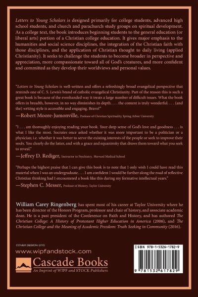 Letters to Young Scholars is designed primarily for college students, advanced high school students, and church and parachurch study groups on spiritual development. As a college text, the book introduces beginning students to the general education (or liberal arts) portion of a Christian college education. It gives major emphasis to the humanities and social science disciplines, the integration of the Christian faith with those disciplines, and the application of Christian thought to daily living (applied Christianity). It seeks to challenge the students to become broader in perspective and appreciation, more compassionate toward all of God's creatures, and more confident and committed as they develop their worldviews and personal values.